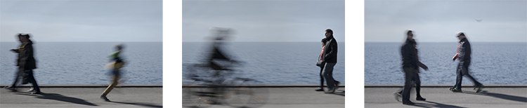 Passent, vites ou lents, j’observe je reste, suivant le mouvement qui me traverse, moi, à ce moment-là… ni vitesse ni lenteur, laisser tout dans l’état de l’apparition. Séquences sans narration : time line without time ; les êtres marquent le seuil d’un récit qui n’aura pas lieu.