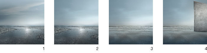 Photoshop : désaturation des cyans et des bleus, retouche (floutage du ciel), recadrage 16/9