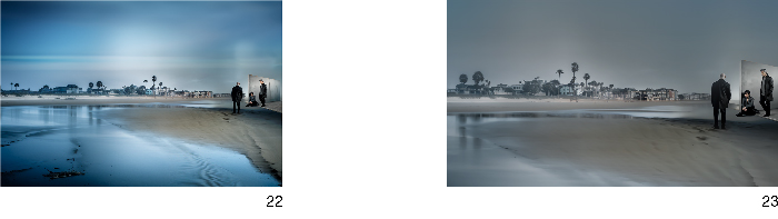 Marguerite Duras avait-elle même réalisé une adaptation filmique de L’amour, en tournant La femme du Gange en 1974. La vision de ses 172 plans fixes signés par Bruno Nuytten n’avait que partiellement recouvert les images que je m’étais forgées à la lecture du texte. Depuis, j’ai toujours imaginé réaliser les photographies, voire un projet filmique, de ces images. En quête de lieux, j’avais cherché le long du rivage lémanique de Vevey un mur, une digue, une grève suggérant la plage à marée basse, un hôtel-casino (le château de l’Aile et la salle du Castillo, peut-être la colonnade de la Grenette). J’avais repéré des temps gris et brumeux, étrangement suspendus entre une impression de torpeur tropicale et de froid normand. Toutefois, rien du cadre réel que j’avais à disposition ne parvenait à rendre l’image juste, sans parler de la question des acteurs. Le temps à consacrer à de nouveaux repérages, à la recherche de cadrages idoines, au travail de retouche des images captées pour que ces images puissent rendre l’image hallucinée par les mots, ce temps finit par effacer le projet.