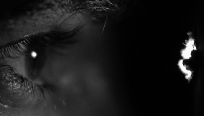 L’ampoule nue suspendue et qui, heurtée, balance, devant elle. La figure surgit, illuminée, hors du fond sombre. Elle éclaire la face de la vieille mère, mais non le creux des orbites vides. Pour nous, ses trous font percée dans l’écran. Ronds noirs en crible sur l’ossature claire, animés par le balancement de la lampe, ombres que l’on croit vivantes dans cette cave - cette tombe.