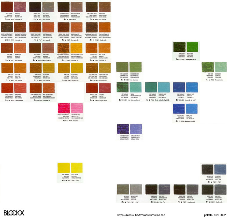 Les couleurs «ternes» avaient été et seront préférées. A savoir les pigments de terre naturelle, la laque de garance transparente, le jaune de Naples, quelques verts ou bleus utilisés en glacis, les gris et noirs. L’exclusion des tons «vifs» est intentionnelle : la couleur «n’est pas» : elle «devient». C’est bien par filtrage progressif qu’elle paraît. Elle n’est point posée, elle sourd et ne saurait s’affirmer. Elle n’est pas couleur-matière mais bien une lumière colorée qui peut surgir de la matière. Pour l’essentiel, terres, oxydes métalliques ou pierres sont les pigments les plus matérialisés, la lumière colorée naissant au regard comme une alchimie. Posés de manière très dilués, les pigments ne doivent pas perdre leur pouvoir de coloration, ce qui explique la choix de la gamme Blockx.